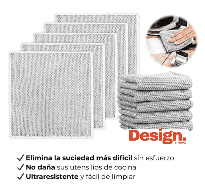 El paño de limpieza CleanPro es la solución definitiva para mantener tu cocina impecable sin esfuerzo. Con su tecnología de mallado doble capa de alambre metálico, podrás eliminar las manchas más difíciles de tus platos, ollas, sartenes, encimeras y más, sin dañar ninguna superficie.