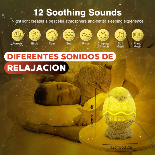 Explora un sueño profundo con la posibilidad de disfrutar de sonidos de ambiente. El DinoEgg presenta una amplia gama de alternativas, desde el sonido de la lluvia hasta el de los trenes y el Mar etc., generando un ambiente tranquilizador para un descanso rejuvenecedor.