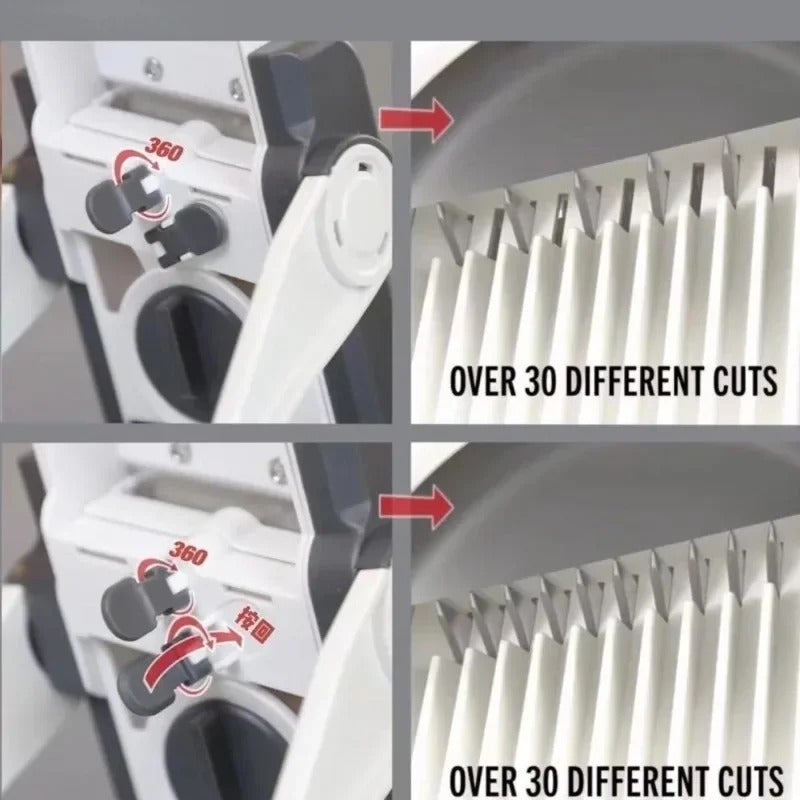 Ajustable en 30 Configuraciones: Selecciona entre cortes gruesos o finos, julianas y fósforos, con grosor ajustable de 1 mm a 8 mm. El dial de corte y los botones específicos hacen que las configuraciones sean rápidas y fáciles. 🔄🔍