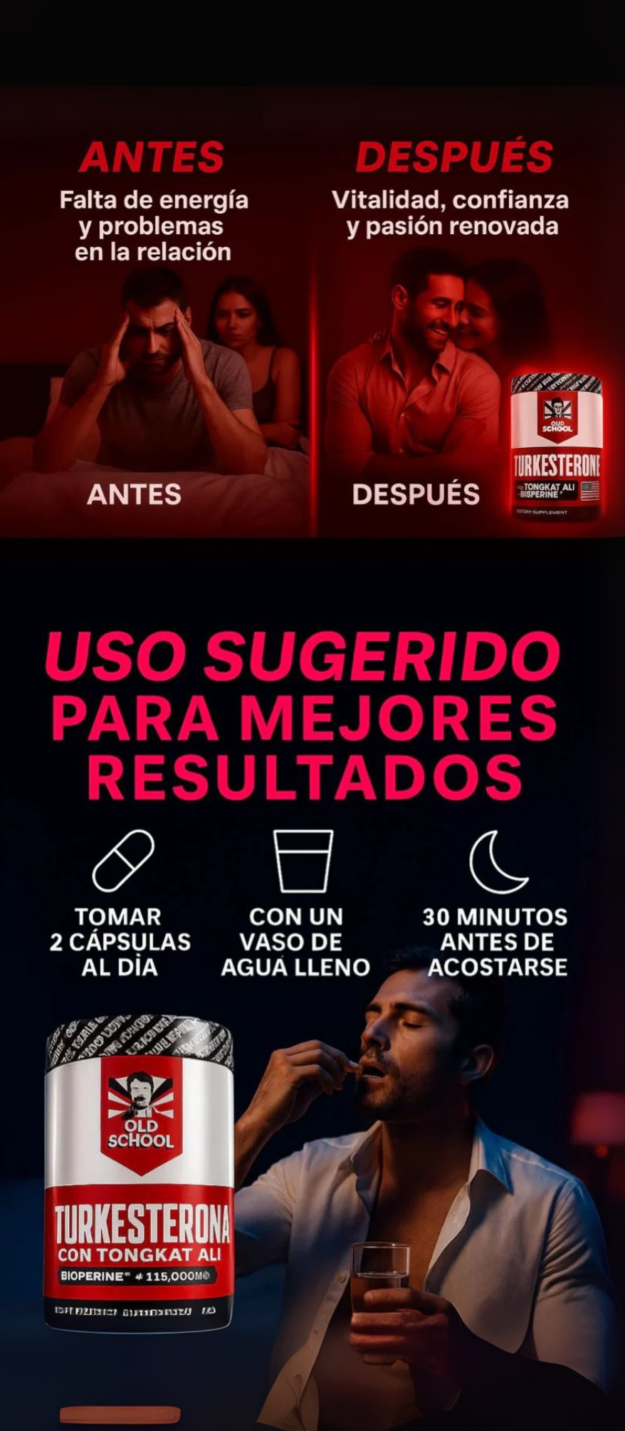 Nuestro suplemento combina ciencia y naturaleza para ofrecerte resultados reales, sin químicos agresivos. Gracias a una fórmula avanzada con extractos altamente concentrados de Ajuga Turkestanica, Tongkat Ali y BioPerine®, actúa en múltiples frentes para transformar tu rendimiento físico y sexual.